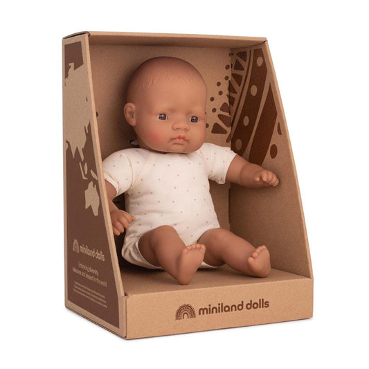 Păpușile Miniland: păpușă latino-americană, 32 cm, cu corp moale din material textil, în cutie cadou, natur.