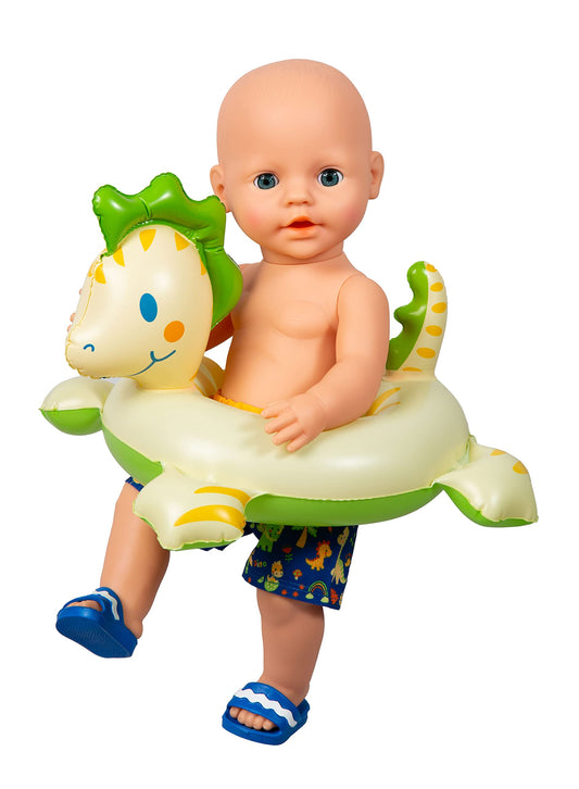 Set de înot Heless 22 pentru păpuși în design cu dinozauri, 3 piese: costum de baie, papuci și colac, pentru păpuși de 35-45 cm, distracție la baie în zilele călduroase de vară.