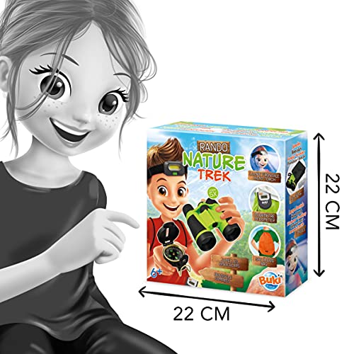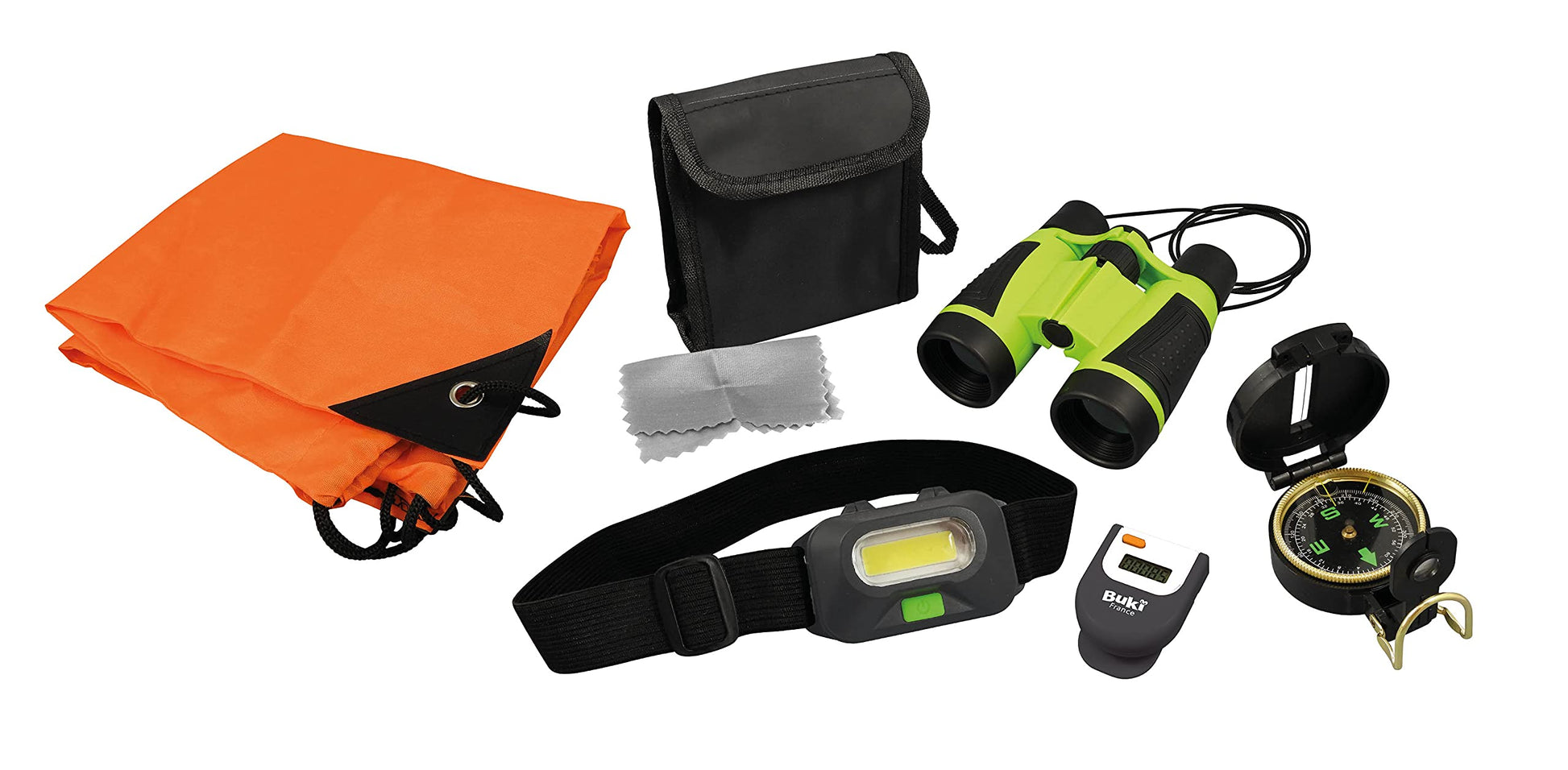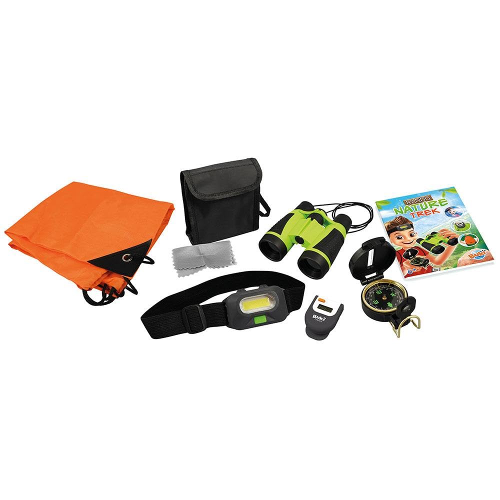 Cutie „Aventuri în pădure și la munte”. Observarea animalelor cu binoclul 5x32 mm, orientare cu o busolă, lanternă frontală pentru o vizibilitate clară în întuneric, pedometru pentru numărarea pașilor. Cu un sac practic și ușor pentru depozitare. Manual ilustrat colorat. De la 6 ani