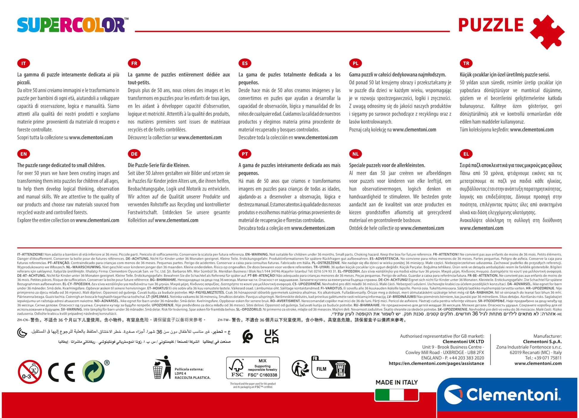 Puzzle pentru copii 104 piese Dimensiunea completă a puzzle-ului: 37,9 x 26,9 cm O gamă largă de puzzle-uri dedicate complet celor mai mici, pentru a-i ajuta să dezvolte abilități de observație, logică și dexteritate. Imagini atractive cu culori vii și strălucitoare, care îi reprezintă pe cei mai iubiți personaje de către copii, pentru a se distra alături de prieteni și familie. Întotdeauna sensibil la problema ecologiei, Clementoni folosește o gamă largă de materiale reciclate, evitând utilizarea componentelor poluante. Fabricat în Italia. Vizitați secțiunea de ajutor a Clementoni pentru a beneficia de serviciul "piese pierdute"