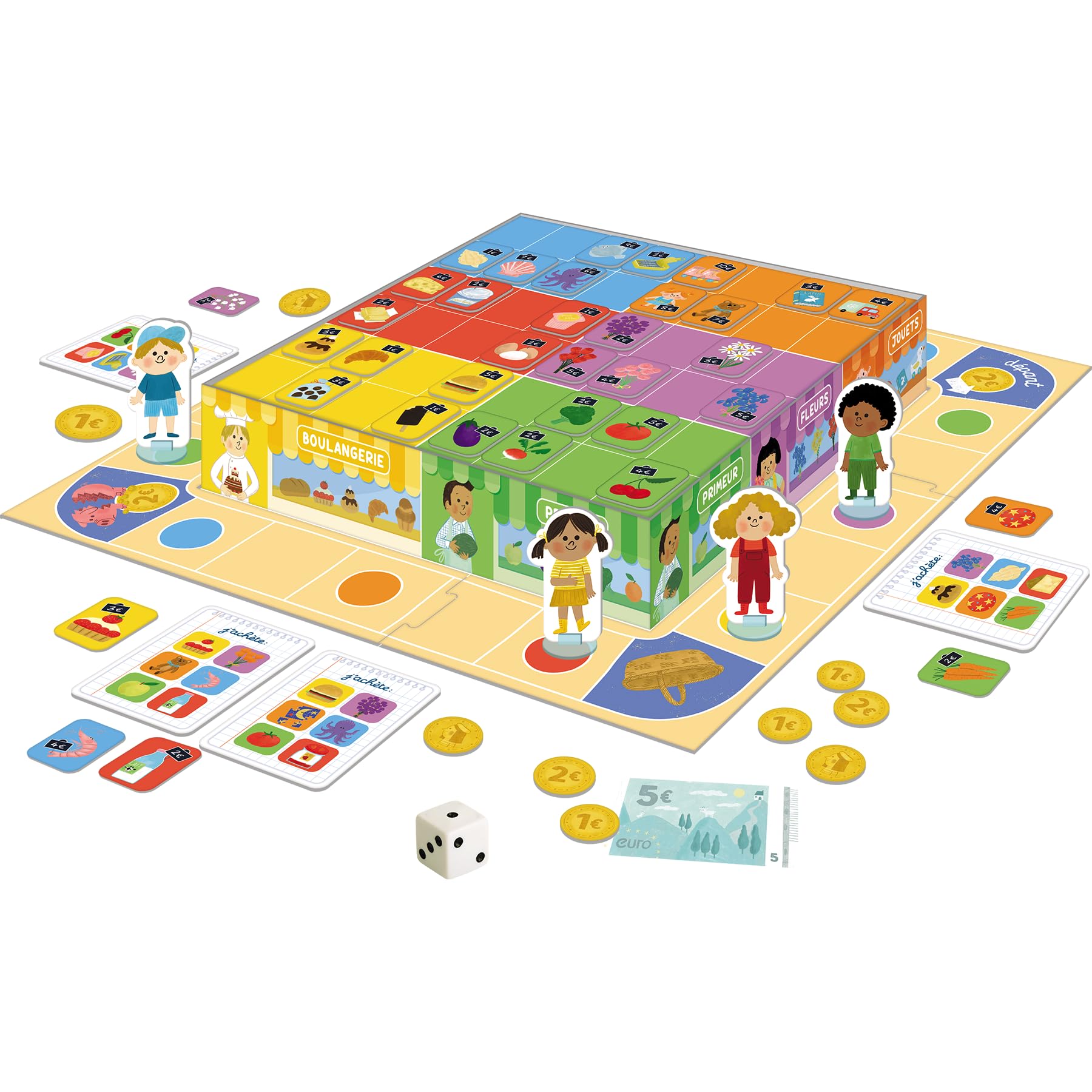 - CONTINUT: un tablou de joc, 4 piese de joc, 16 bancnote de 5€, 48 monede de 1€, 24 monede de 2€, 8 liste de cumpărături, 48 chipsuri de articole și un zar.