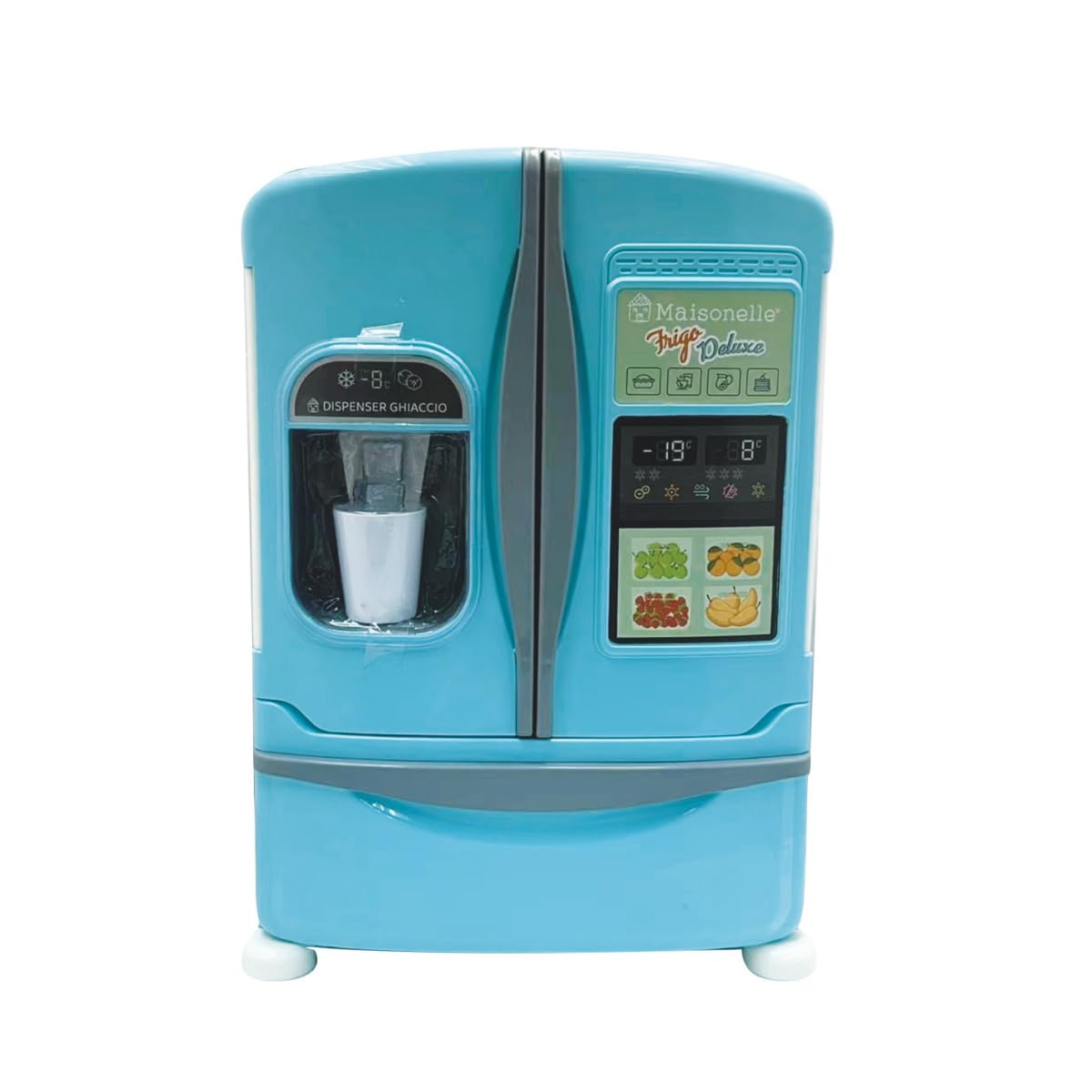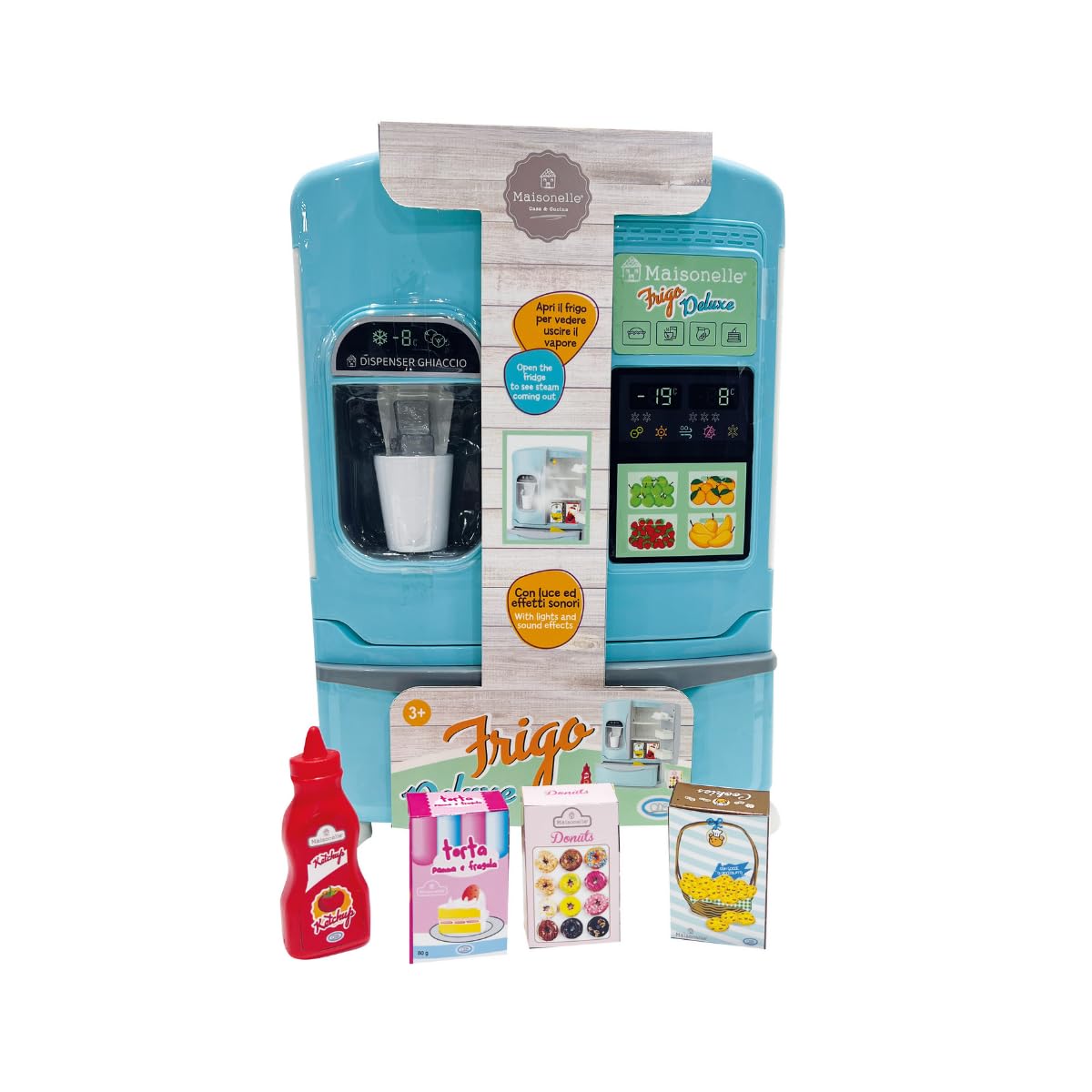 - Frigider deluxe: frigiderul deluxe Maisonelle este echipat cu iluminare interioară, sunete realiste și efect de abur, oferind o experiență de joacă captivantă și interactivă pentru copii. Funcționează cu 3 x 1,5 V baterii AA (nu sunt incluse)