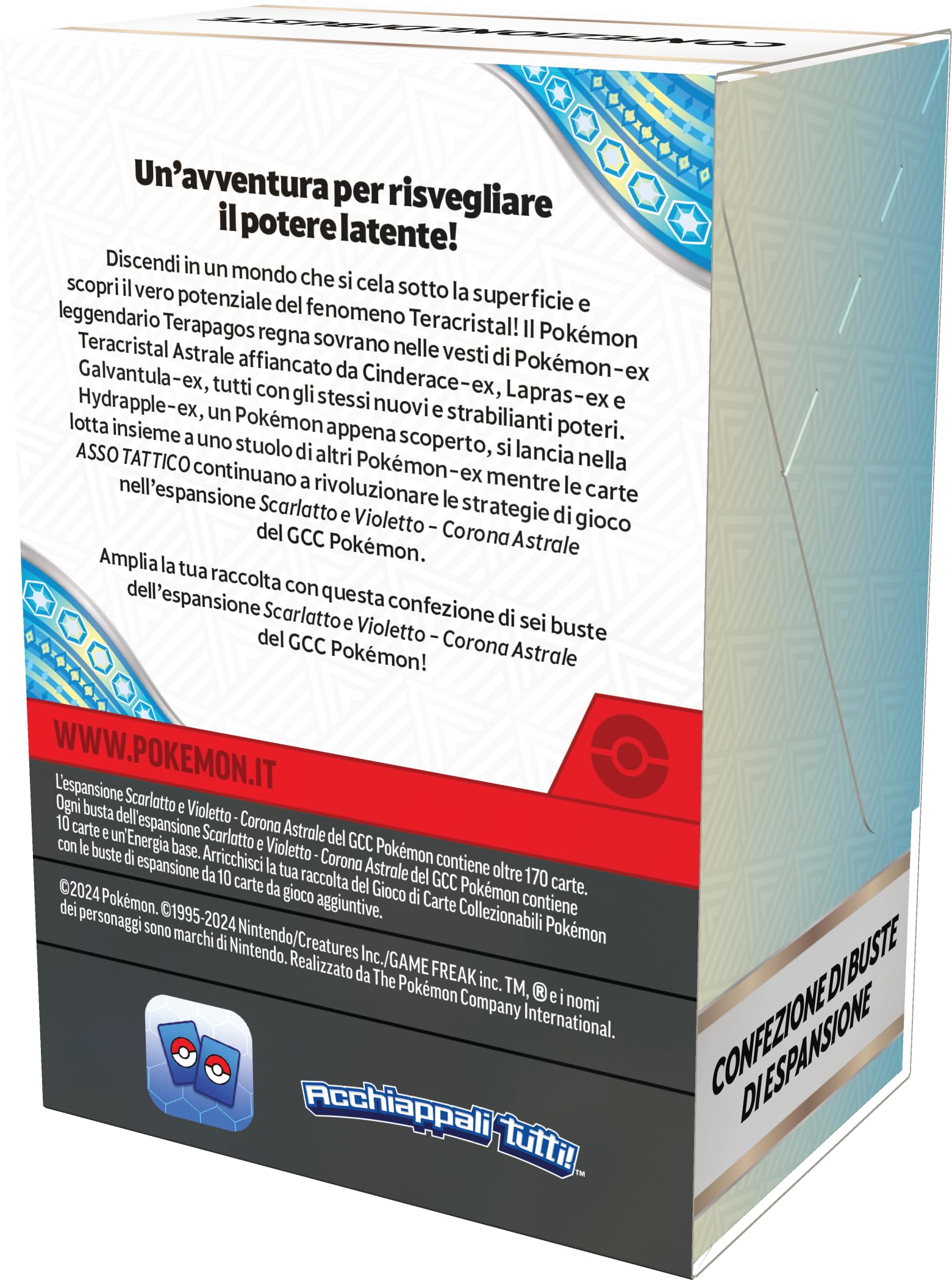 - Conține șase pachete de extensie din setul Scarlet și Violet Astral Crown Pokémon TCG. Fiecare pachet de extensie conține 10 cărți de joc și o Energie de bază. Cărțile variază în funcție de pachet.