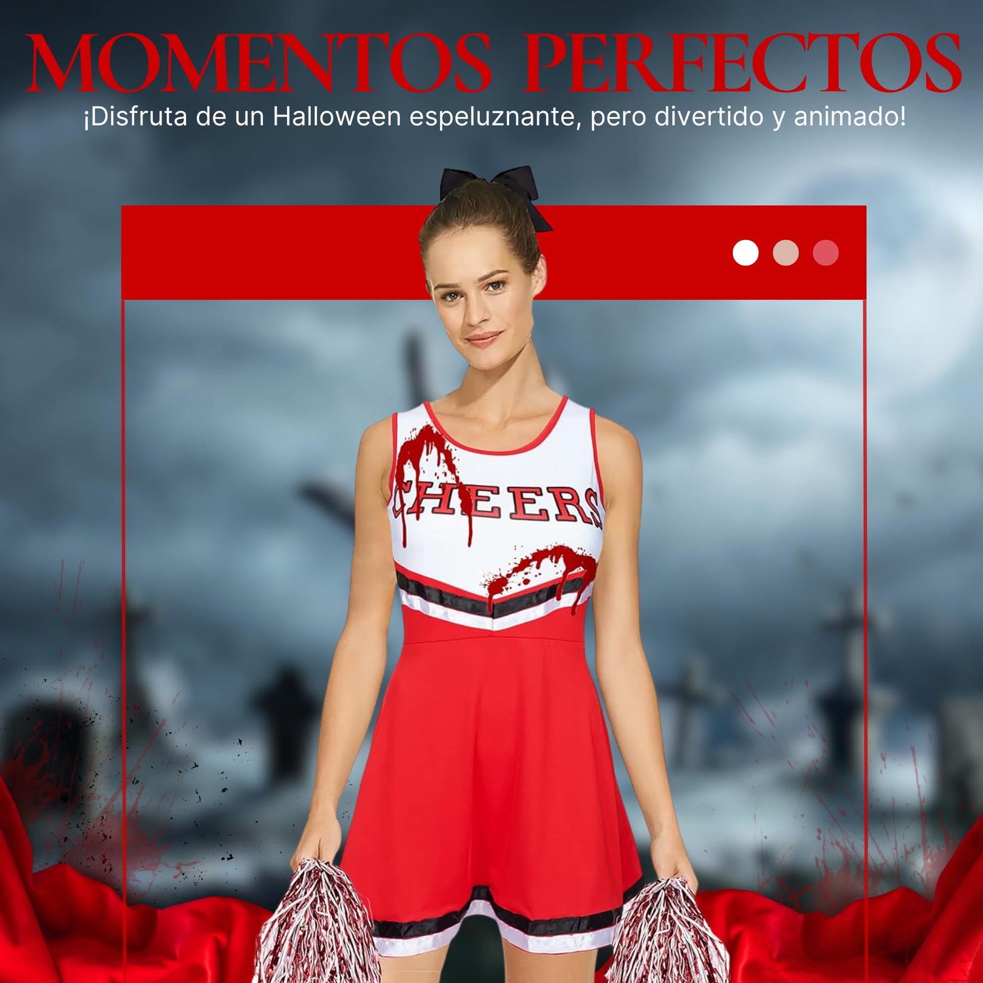 - Costumul de cheerleader de Halloween este un costum atemporal de mort viu pentru adulți, pe care femeile îl pot purta la petreceri de costume de Halloween sau ca parte a unui costum de cheerleader mort pentru Ziua Mondială a Cărții.