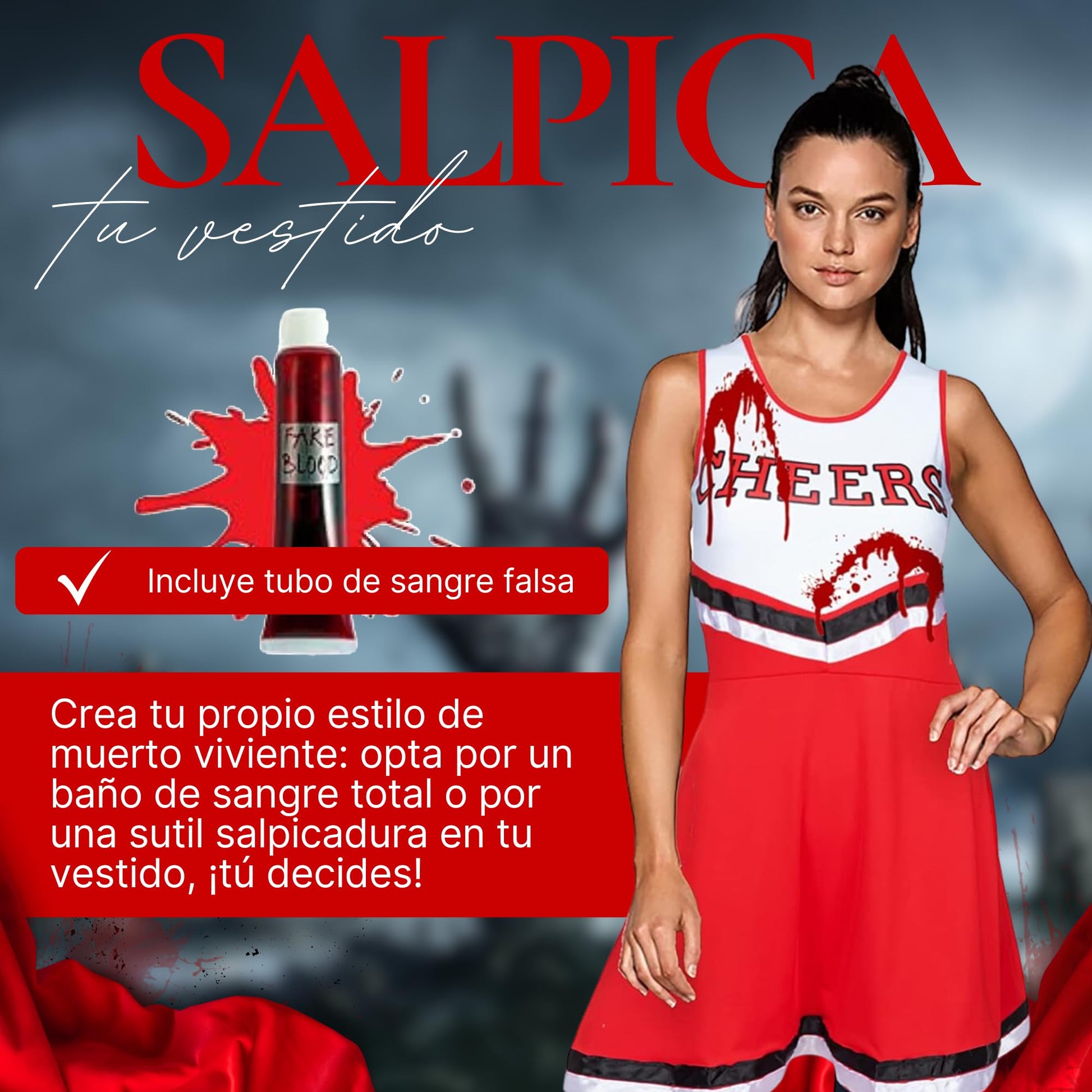 - Costum de cheerleader zombie: poți alege culoarea costumului tău de cheerleader din cele 6 variante disponibile; fiecare rochie de cheerleader vine cu un tub de sânge fals, astfel încât poți adăuga cât sânge dorești costumului tău de zombie pentru femei.