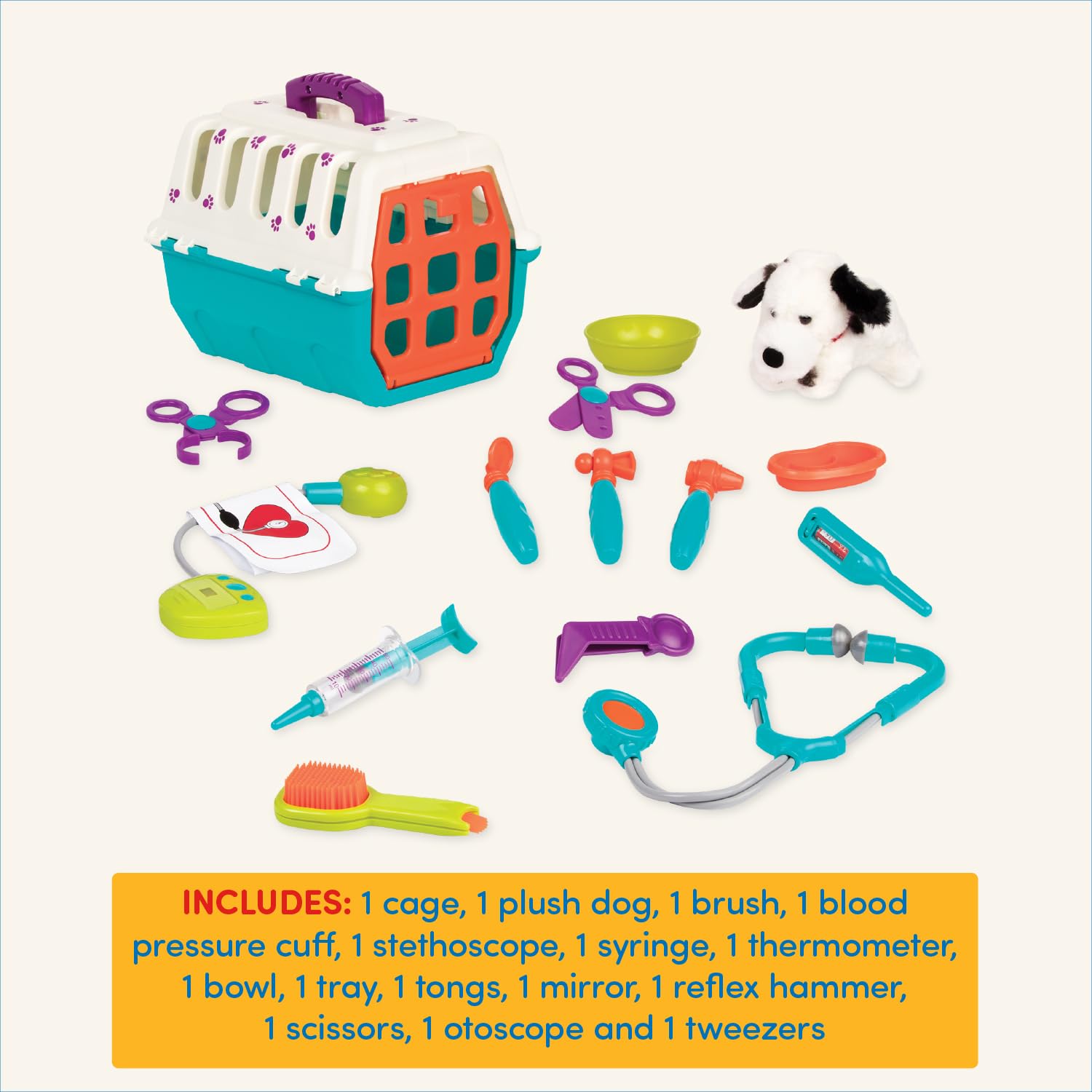 • 15 piese: Include un dalmațian de pluș, cușcă de transport, stetoscop, perie, seringă, termometru, bol, tavă renală, clește, oglindă, ciocan reflex, manșetă pentru tensiune, foarfecă, otoscop și pensetă.