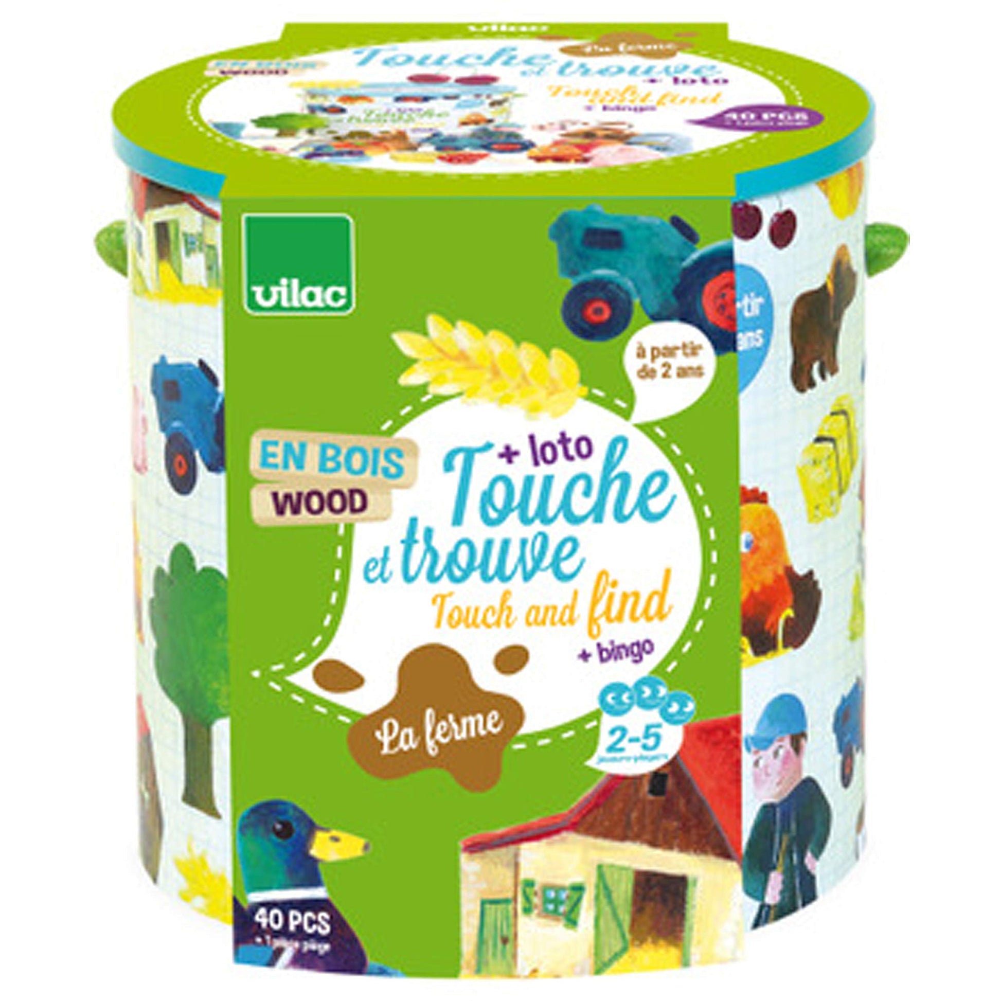 Jocul indispensabil Touche and Find într-o versiune solidă. Touche and Find este un joc de recunoaștere tactilă, în care trebuie să îți bagi mâna în sac pentru a găsi monede, fără a te uita. Conține un butoi de depozitare, 21 de piese din lemn, inclusiv o monedă de capcană, 20 de cărți ilustrate pe tema fermei. Cu aceste cărți ilustrate, jocul de prindere și găsire devine și un joc de loto.
