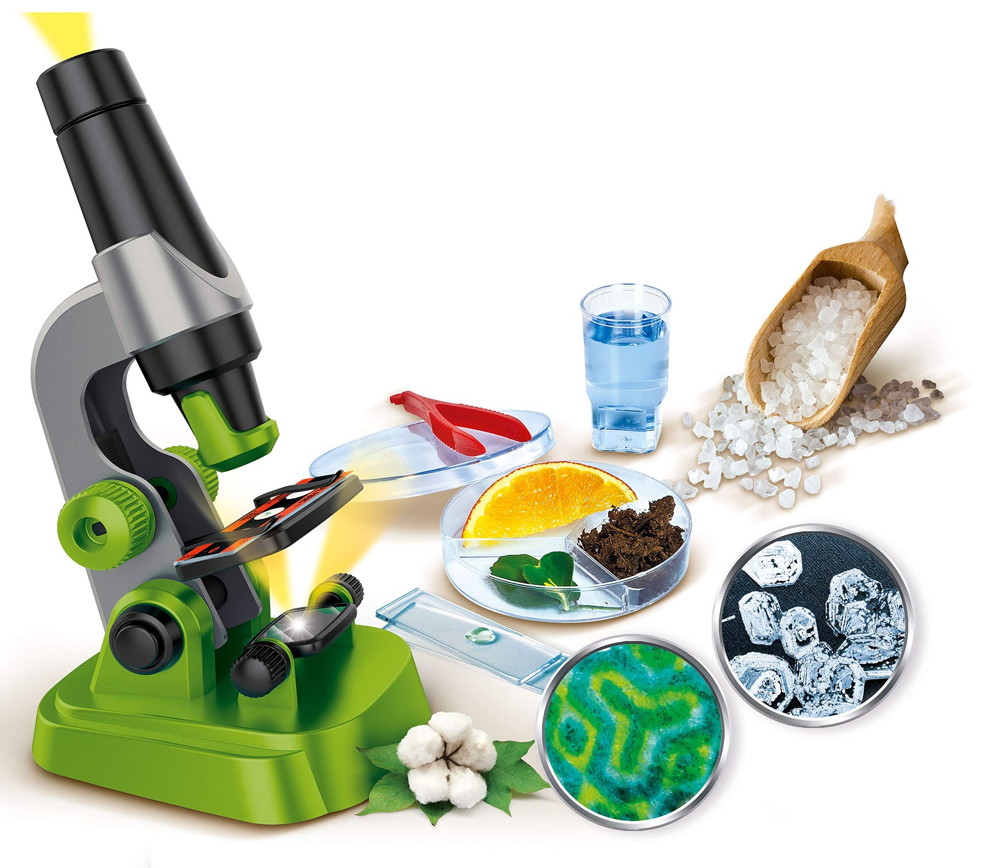 Acest mini-laborator este activitatea perfectă pentru viitorii biologi! Kitul conține tot ce este necesar pentru a explora cele mai mici structuri ale obiectelor: un microscop real, portabil, cu măriri de până la 150 de ori, un preparat deja pregătit și diverse alte lame. Cu acest microscop, micii iubitori de natură își fac primii pași în lumea științei din confortul camerei lor. Setul de experimente aduce știința microbiologiei mai aproape de copilul tău într-un mod distractiv. Ca dar de Paște, Crăciun sau zi de naștere, cu siguranță va aduce zâmbete pe fețele celor mari și mici.