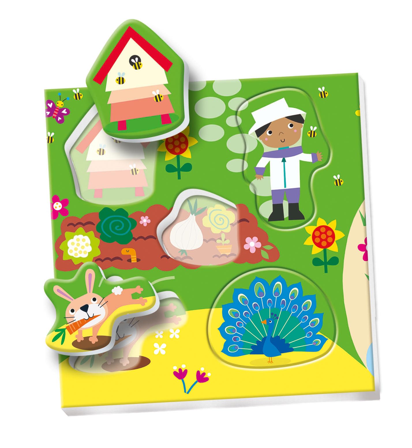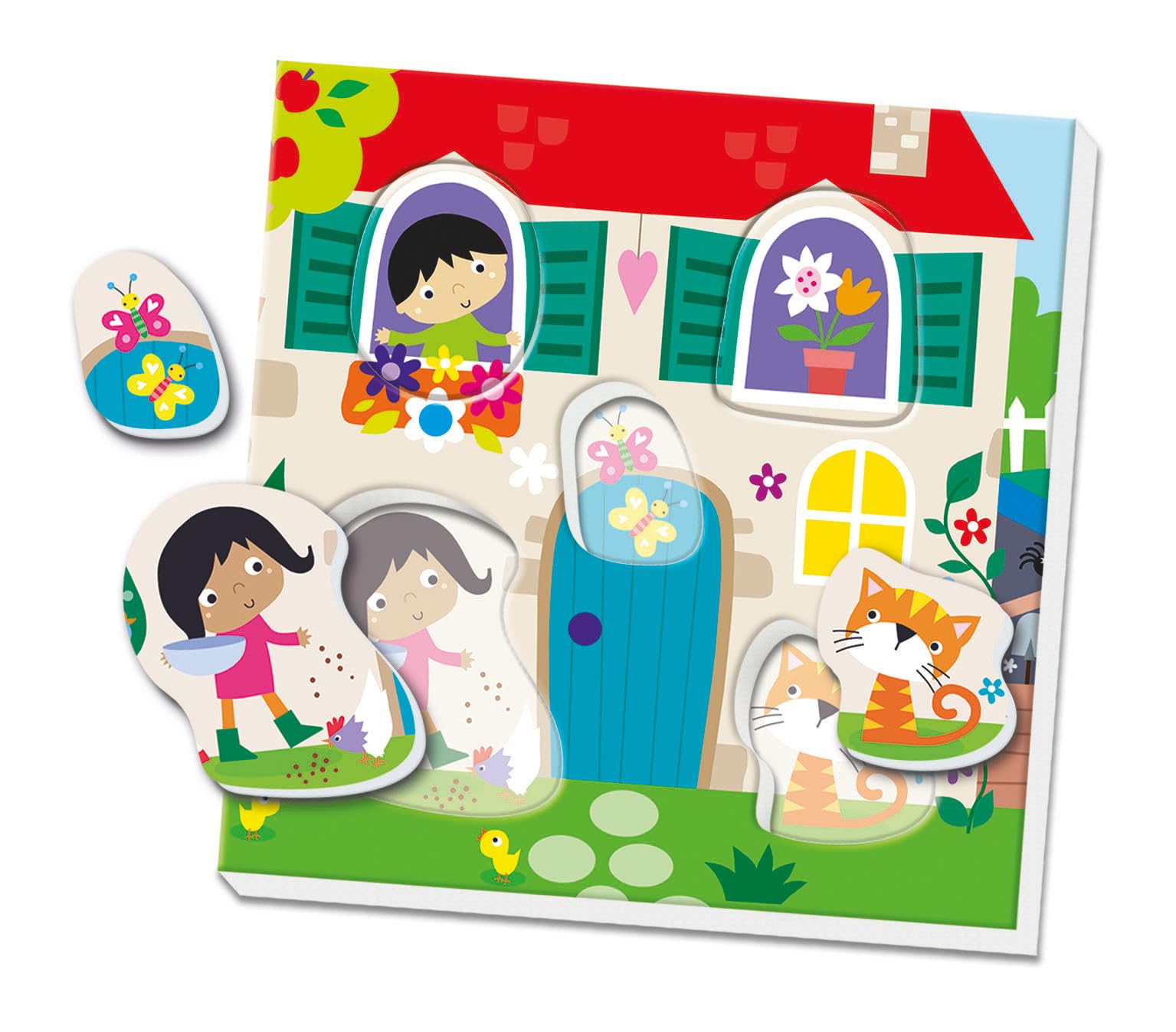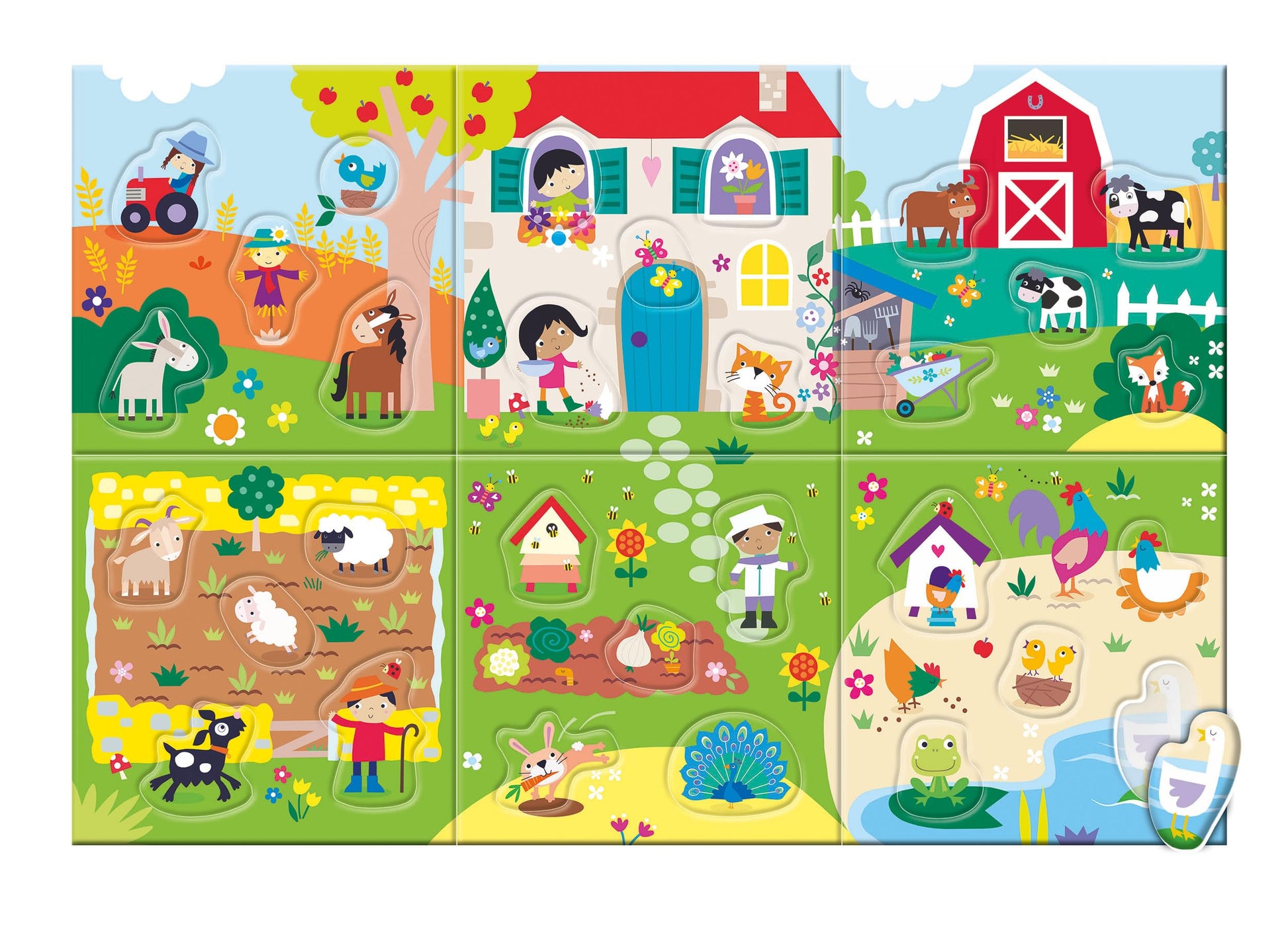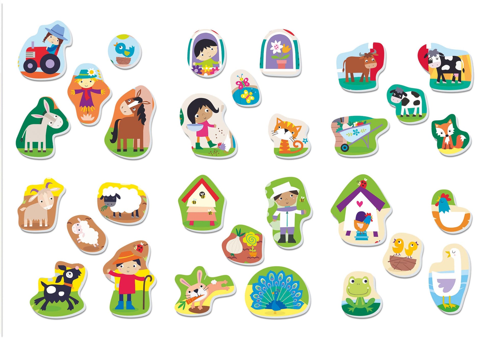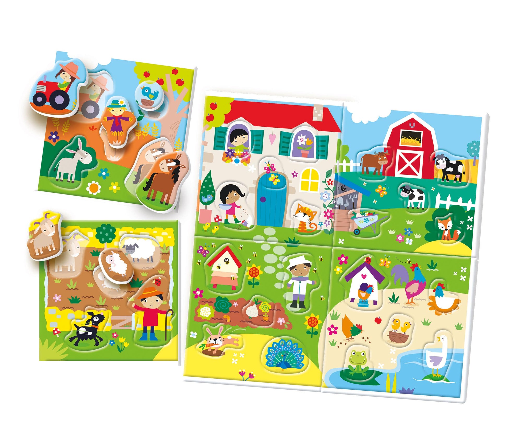 - Ferma Montessori: Un puzzle colorat și mare, ideal pentru introducerea copiilor în lumea animalelor de fermă prin metoda Montessori; stimulează curiozitatea, dexteritatea și limbajul încă din primii ani.