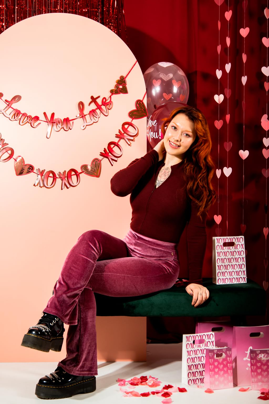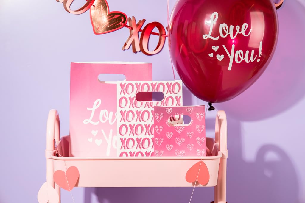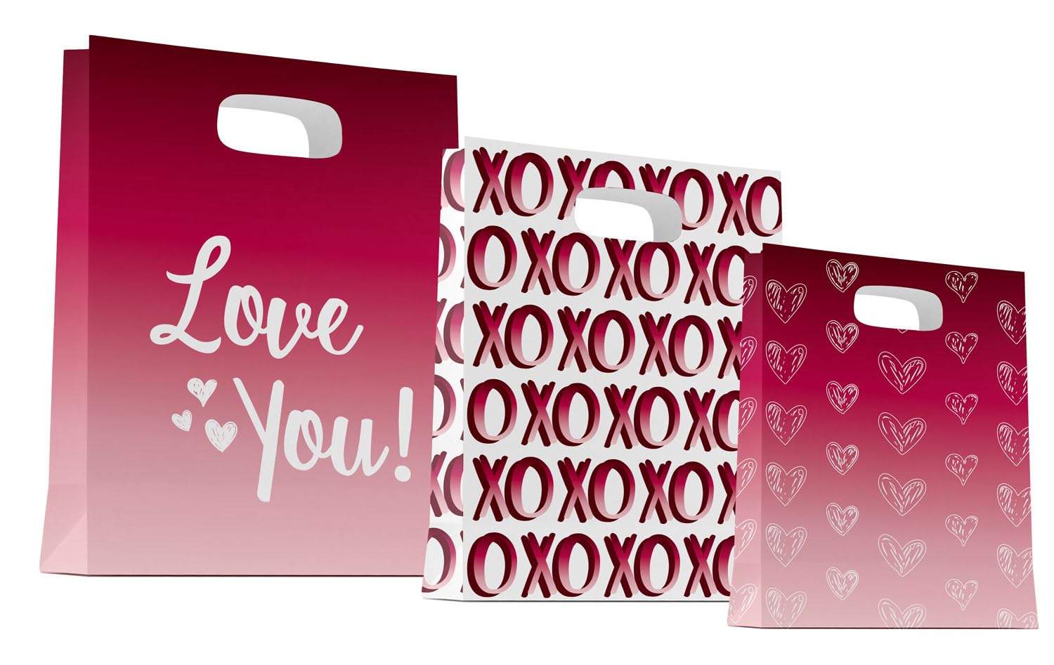 - Trei pungi frumoase pentru a oferi dragoste. Fiecare geantă are o dimensiune diferită: 27 x 20 x 10 cm (efect Ombre roșu cu text alb "Love You"), 23 x 15,5 x 6 cm (alb cu efect Ombre roșu și text "XOXOXO") și 18 x 12 x 6 cm (efect Ombre roșu cu inimi albe). Toate pungile sunt imprimate pe ambele părți.