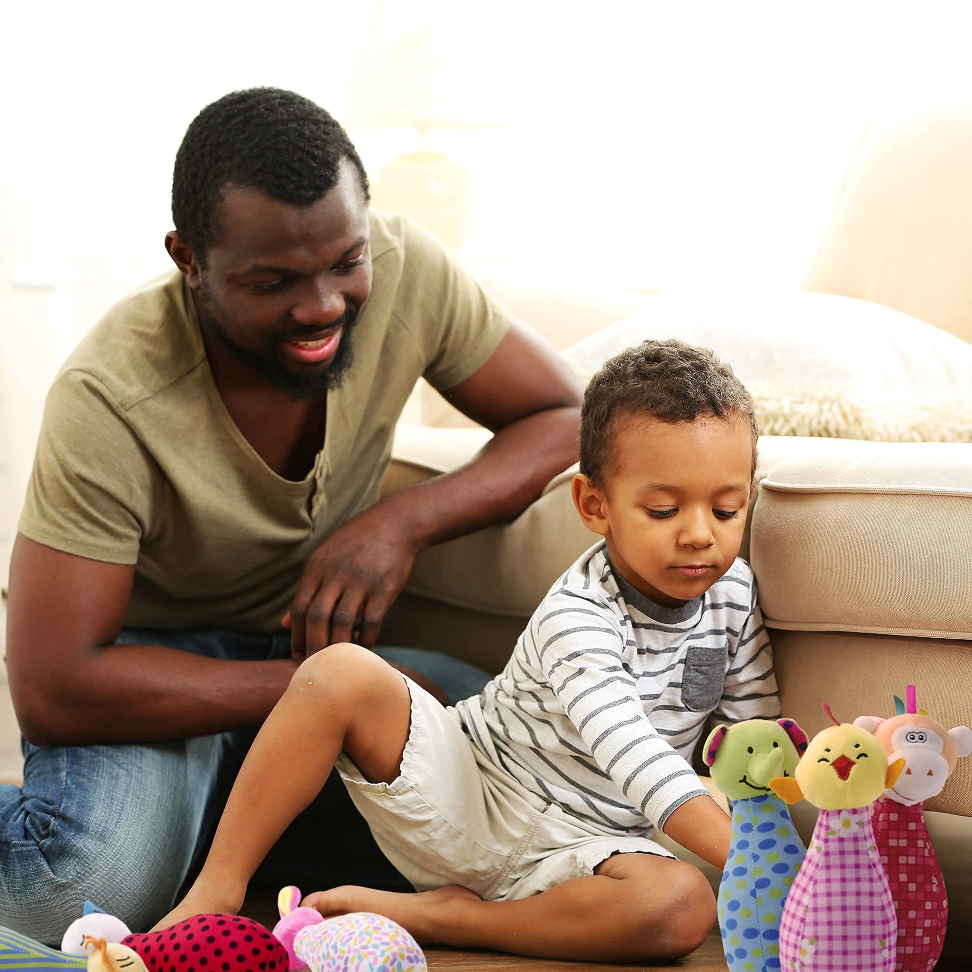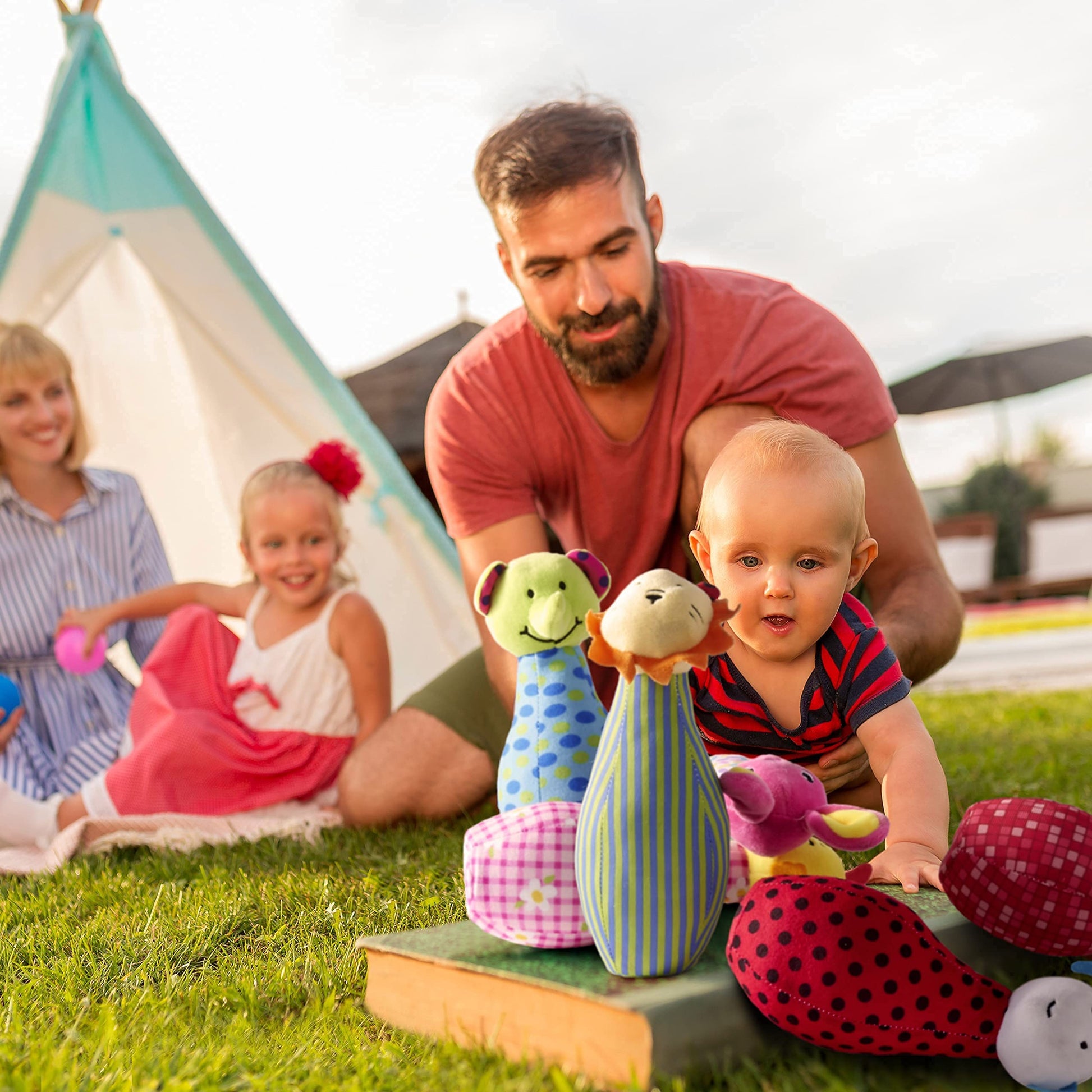 - 🎳 COLORAT ȘI DISTRACTIV - Setul de bowling și minge pentru bebeluși prezintă modele și culori strălucitoare care îi vor încânta pe cei mici.