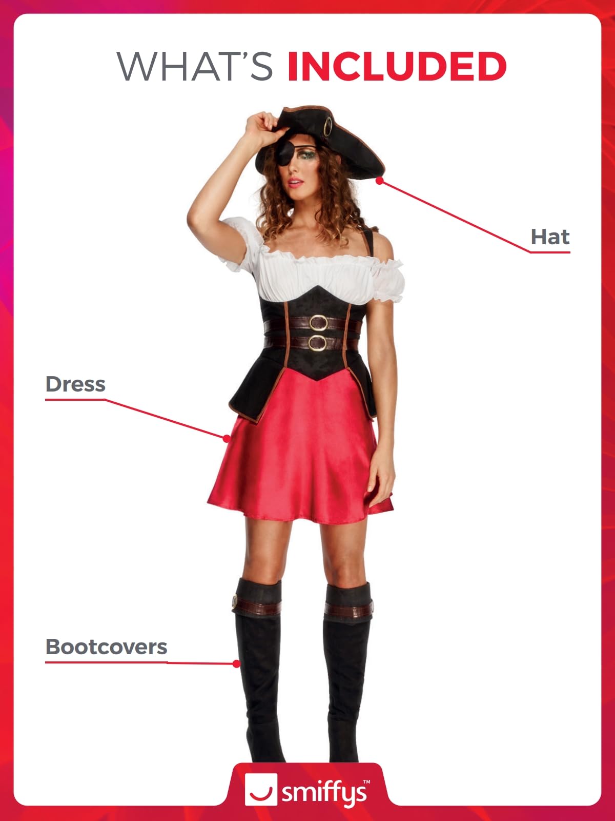- Conținut livrare: 1 costum de pirat pentru femei Smiffys, rochie cu poale, pălărie și cizme, nu include: mască pentru ochi și cizme, culoare: roșu, dimensiune: M