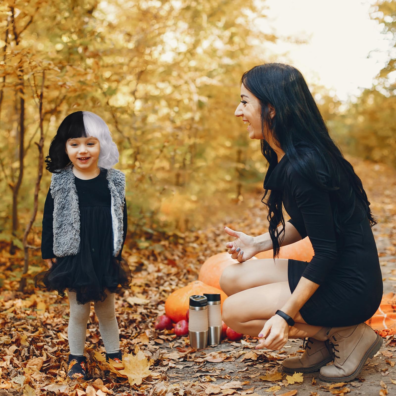 - Perucă alb-negru: Această perucă alb-negru este natural moale, cu o rețea elastică pentru o purtare ușoară. Părul scurt și ondulat, la modă și unic, face ca costumul copilului să fie perfect.
