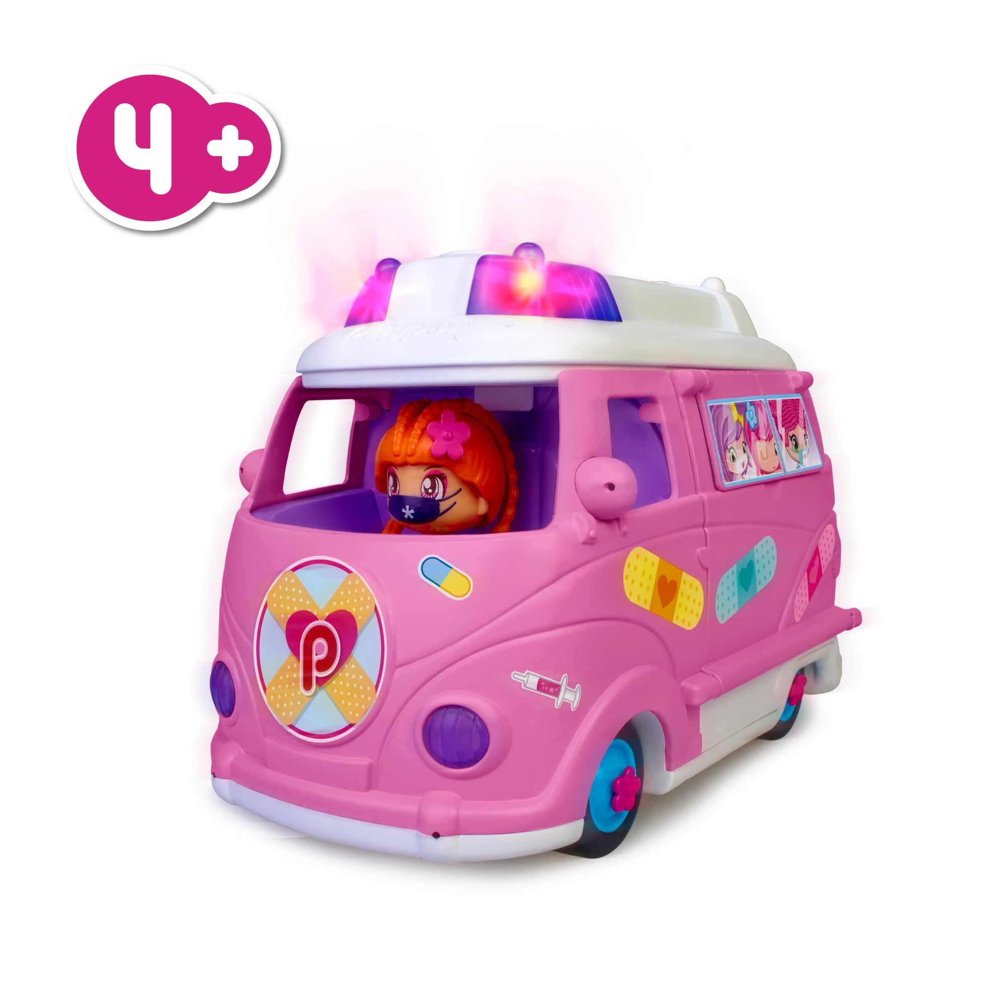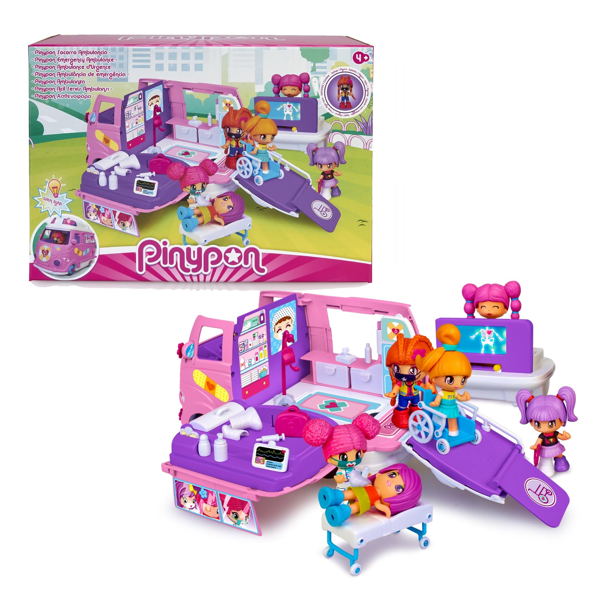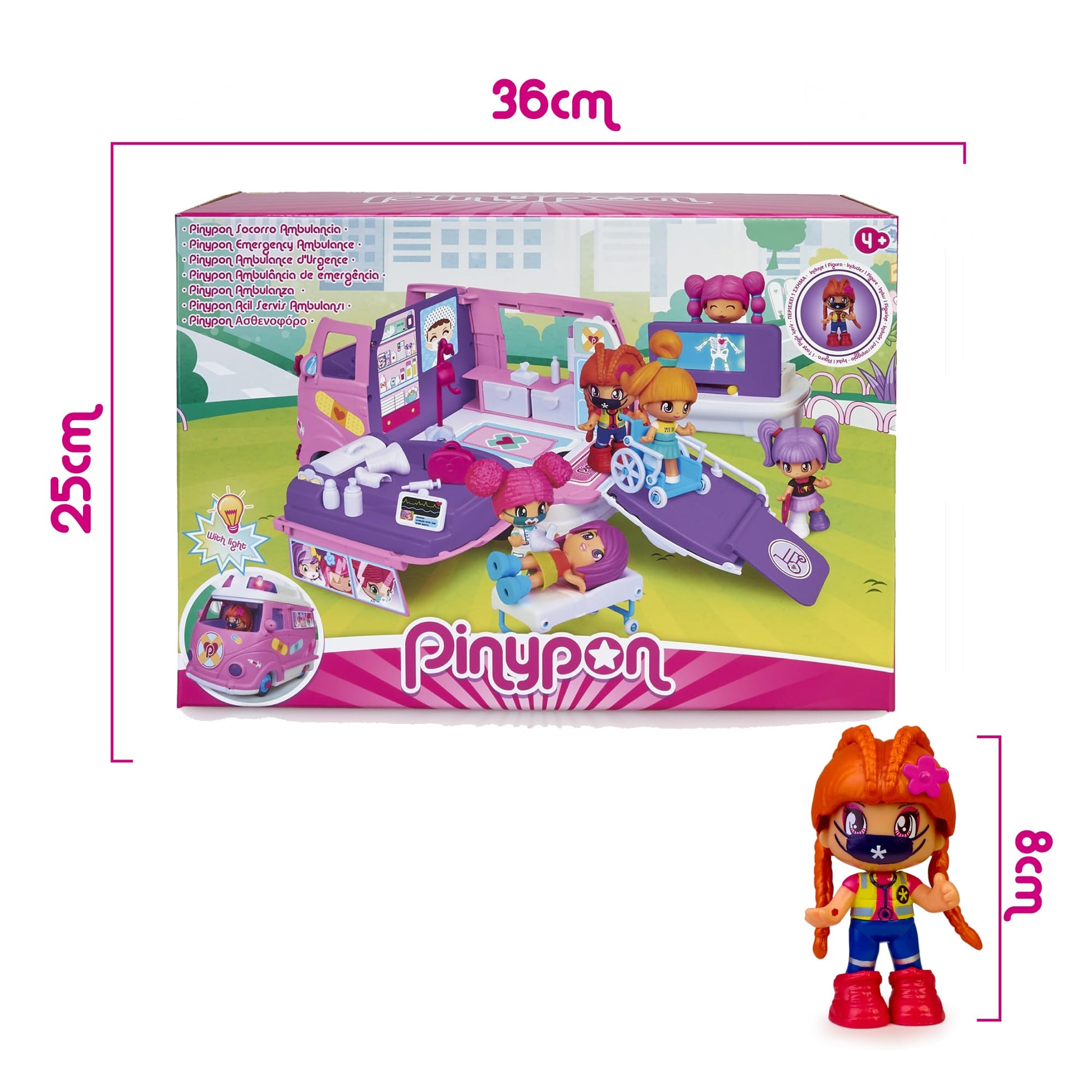 - Un ambulanță Pinypon roz, super echipată, pentru a transporta Pinyponii bolnavi la spital, cu lumini și sunete pe acoperiș, sirenă și aparat de radiografie.