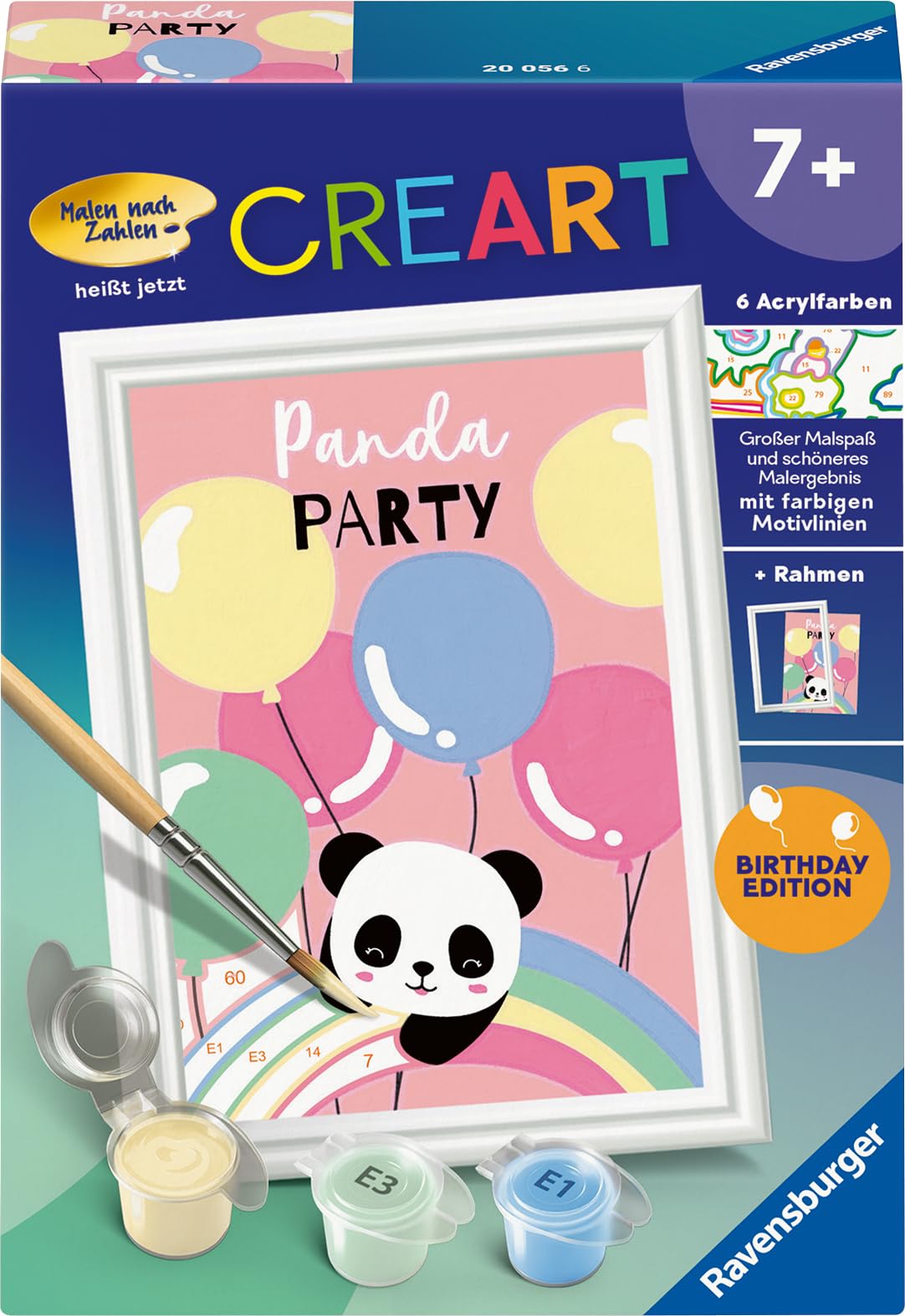 Linii colorate ale motivului: Distracție mai mare la pictat & un rezultat mai frumos! Datorită liniilor colorate ale motivului, copiii pot recunoaște mai repede întregul motiv Panda Party și culorile. Pensula are o bună direcție, astfel încât, treptat, se formează o imagine perfectă. Motivele frumoase de colorat sunt o idee minunată de cadou pentru copiii de peste 7 ani și o frumoasă decorare pentru camera copiilor. Acest set de pictură conține deja 6 culori acrilice gata amestecate. Cu pictura după numere de la Ravensburger, copiii învață să coloreze cu atenție suprafețele, să își îmbunătățească talentul artistic și să dezvolte abilități motrice fine. La final, se simt fericiți, mândri și au o experiență de succes care le stârnește dorința de a continua să picteze. Motivele sunt adaptate vârstei în trei niveluri de dificultate: de la imagini simple cu puține suprafețe mari de colorat până la imagini cu multe suprafețe mici pentru avansați. Fiecare set de pictură conține tot ce au nevoie artiștii pentru a picta și nu este necesară amestecarea culorilor. Programul de pictură după numere de la Ravensburger oferă o mare varietate de motive pentru copii și adulți.
