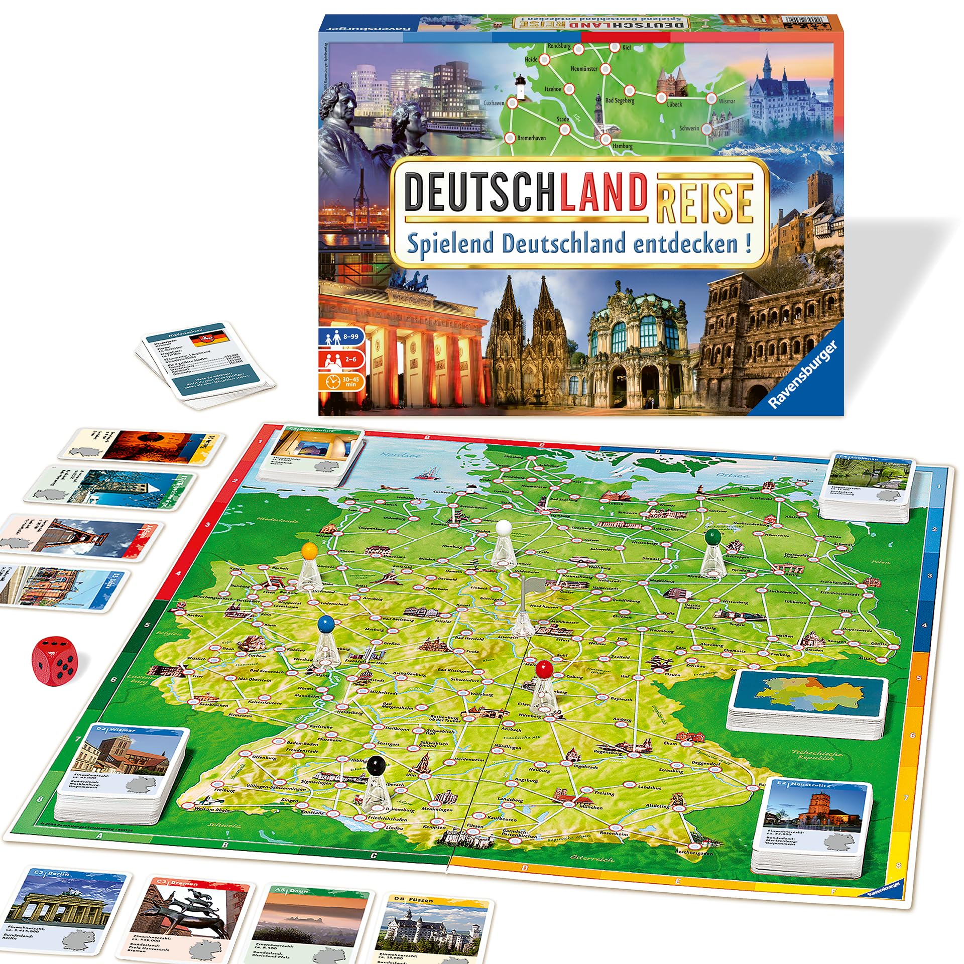 "Călătoria prin Germania" - jocul de curse pentru până la 6 jucători. Mai întâi să vizităm pe Winnetou în Bad Segeberg și apoi să vedem cel mai mare butoi de vin din lume în Heidelberg? Sau mai întâi la catedrală în Köln? Jucătorii jocului de societate se angajează într-o călătorie captivantă și informativă prin Germania. Obiectivul: Să vizitezi opt orașe și să fii primul care se întoarce la punctul de start stabilit anterior. Jucătorii încearcă să planifice o rută ideală de călătorie. La acest clasic, toți călătorii se așteaptă la peste două sute de atracții turistice, cum ar fi Poarta Brandenburg sau orașe interesante precum Rothenburg ob der Tauber. Acestea sunt prezentate în cuvinte și imagini. Cu cărți de acțiune interesante, călătoria proprie poate fi accelerată sau cea a colegilor încetinită! Cu o bună planificare, puțin noroc la zaruri și utilizarea abilă a cărților de acțiune, călătoria captivantă prin Germania poate fi finalizată prima.