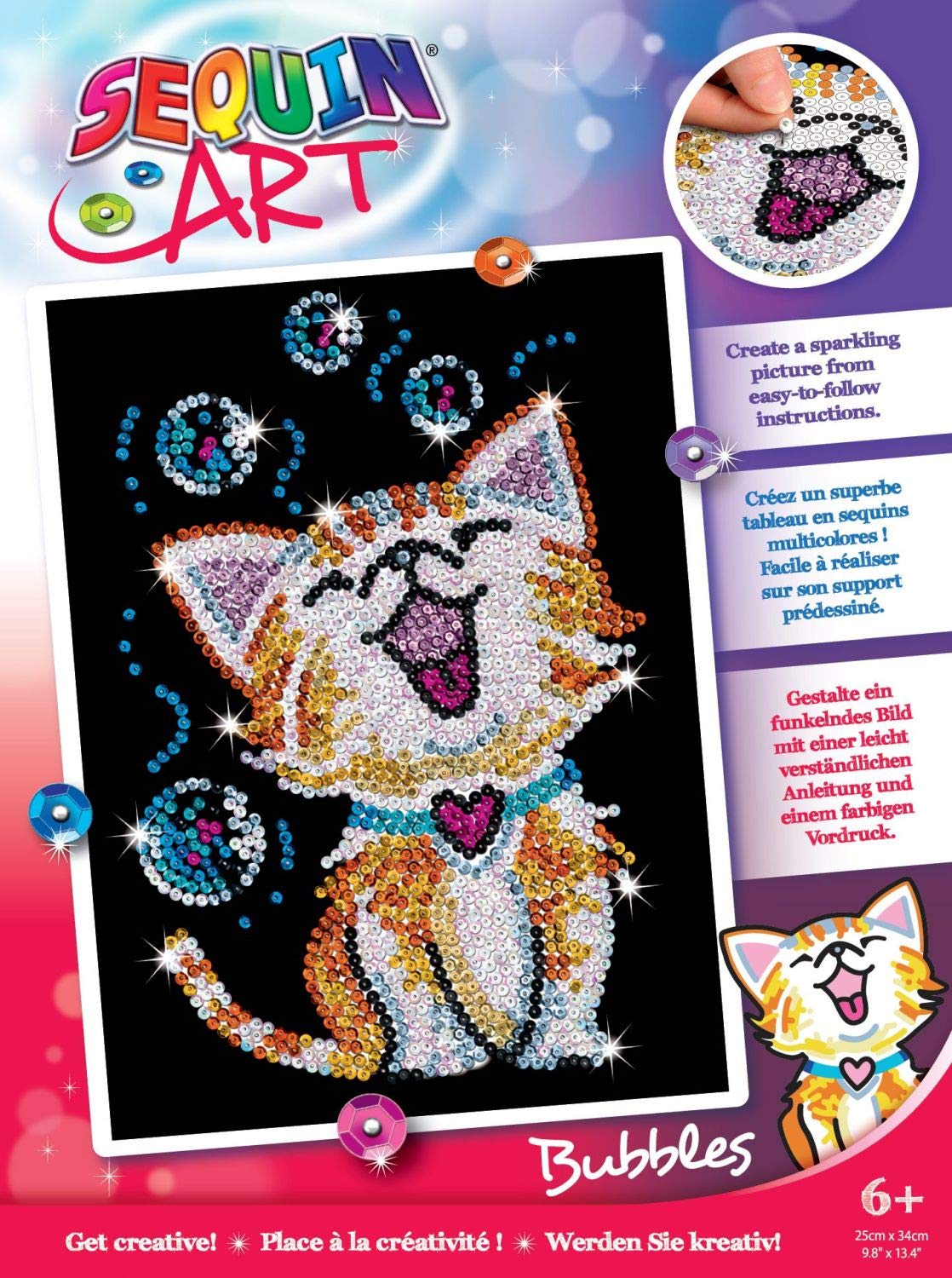 Creează artă strălucitoare cu paiete cu acest kit cu pisicuța Bubbles! Arta cu paiete este o activitate excelentă de craft pentru copii (8+) și îi va menține distrați timp de ore; imaginează-ți cum creezi opere de artă fabuloase și te bucuri de capodopera ta în anii următori; înrămează proiectul finalizat, agăță-l și bucură-te de el! Distracție perfectă în timpul vacanțelor școlare sau ca activitate în interior în zilele ploioase; adolescenții vor adora să folosească această imagine uimitoare ca decor pentru cameră. Kitul conține o imagine pretipărită care poate fi transformată într-o operă de artă strălucitoare cu paiete; o placă din polistiren alb este inclusă ca bază și cadru; metoda de fixare a paietelor în loc învață concentrarea și ajută la dezvoltarea coordonării mână-ochi; arta cu paiete este foarte satisfăcătoare și ușor de realizat, atât pentru începători, cât și pentru cei experimentați; imaginea pretipărită este colorată conform paietelor corespunzătoare pentru o identificare ușoară; desenele pot fi realizate după culoare sau model, începând mai întâi cu marginea sau lucrând în rânduri și linii; supravegherea unui adult este necesară pentru copiii sub 8 ani din cauza acelor. Fiecare kit conține: cadru de bază din polistiren, imagine colorată, paiete colorate, ace și instrucțiuni. Dimensiunea imaginii: 250mm x 340mm